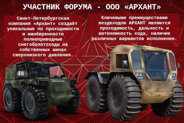 Компания создаёт уникальные по проходимости и манёвренности полноприводные снегоболотоходы на собственных шинах сверхнизкого давления. По словам главы технического отдела ООО «Архант» Алексея Гринько, на выставке можно будет увидеть бюджетную модель вездехода, которая при сниженной стоимости сохранила практически безграничные способности преодолевать любое бездорожье, снег, лёд и водные преграды.